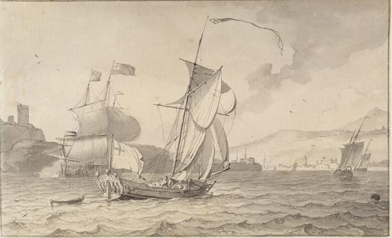 Veiling Ploos van Amstel 1800, p. 176, Kunstboek FF,nr 3: 'Een wedergaê van de voorgaande, zynde een kabbelend water met een spiegeljagt en andere vaartuigen; ter zynde hoog gebergte, waarop een kasteel; behandeld als de voorgaande, door denzelven ( Ludolf Bakhuysen). Hoog en breed als de voorige (4¾ x 7½ duim)' (f 57,- , aan Jolles); Veiling Jolles 1848, p. 2, Kunstboek A, nr. 6: 'Dezelfde (Ludolf Bakhuysen). Een Gezigt op de Engelsche kust, zijnde een kabbelend water, met spiegeljagt, met o.i. inkt.' (f 40,- aan Brondgeest); Collectie C.J. Fodor, legaat 1860