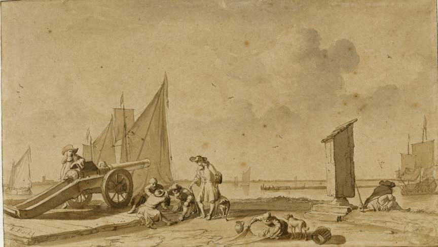 Collectie V. Röver (1686-1739); Veiling Goll van Franckenstein 1833, p. 123, Kunstboek KK, nr 3: ' Dezelfde (Ludolf Bakhysen). Een riviergezigt, op den voorgrond gestoffeerd met eenige persoonen bij een kanon; verder eenige schepen. Als voren (uitmuntend fraai van behandeling met de pen en bruine inkt)' (f 150,- aan Brondgeest); Veiling Verstolk van Soelen 1847, p. 16, nr 80: 'Ludolf Bakhuyzen. Vue d´une partie des anciens remparts, dit le "Blaauwe Hoofd" à Amsterdam; au premier plan des militaires se trouvent autour d´une grande pièce de canon, dirigée vers l´Y; quelque uns de ses militaires s´amusent à jouer, et sur l´Y on aperçoit plusieurs vaisseaux à voile. L´exécution à la plume et au bistre, de même que l´effet du soleil est d´un grande beauté.' (f 393,- , aan van Brondgeest voor Fodor); Legaat C.J. Fodor, 1860