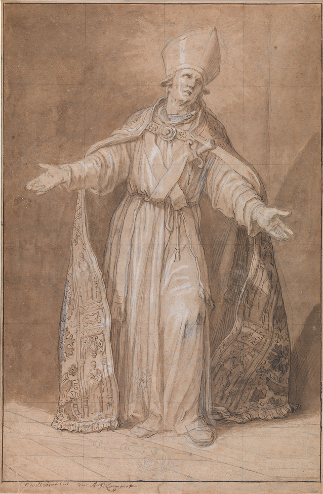 C. Ploos van Amstel Jac. Cornelisz., veiling Amsterdam (Ph. v.d. Schley, J. de Bosch Jeronz., B. de Bosch Jeronz., J. Yver en C.S. Roos) 3 maart 1800 e.v.d., wschl. Kunstboek G, nr. 26: 'St. Willebrordus, staande ten voeten uit; met de Pen, Roet en Wit, door A. Bloemaert.' (Fl 11,- aan Van Leen); coll. J. Goll van Franckenstein, niet terug te vinden in de catalogus van de veiling Amsterdam (J. de Vries, A. Brondgeest, E.M. Engelberts en C.F. Roos) 1 juli 1833 e.v.d.; coll. Mr. W. Baartz, veiling Rotterdam (A.J. Lamme) 6-8 juni 1860, Livre P, nr. 340: ' A. Bloemaaert. L´évêque Wildebrordus. Sepia.', samen met nr 341: J. Lievens. ' L´entrée d´un jardin; dans un allée se promènent une femme avec un enfant suivi d´un chien. A la plum.' (Samen Fl. 33,- aan Lamme voor Fodor, Lievens´ tekeningen is het huidig inv. nr. TA 10207); legaat c.j. Fodor, 1860
