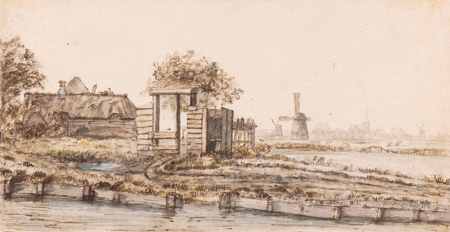 Veiling De Vos 1833, p. 6, nr. 5: 'Adriaan van Borssum. Een landweg aan een watertje met den ingang tot een boeren woning, molens, en een dorp in het verschiet. Meesterlijk met de pen, dun met sapverwen en natuurlijk voorgesteld' (f 57,-, Brondgeest); Legaat C.J. Fodor 1860