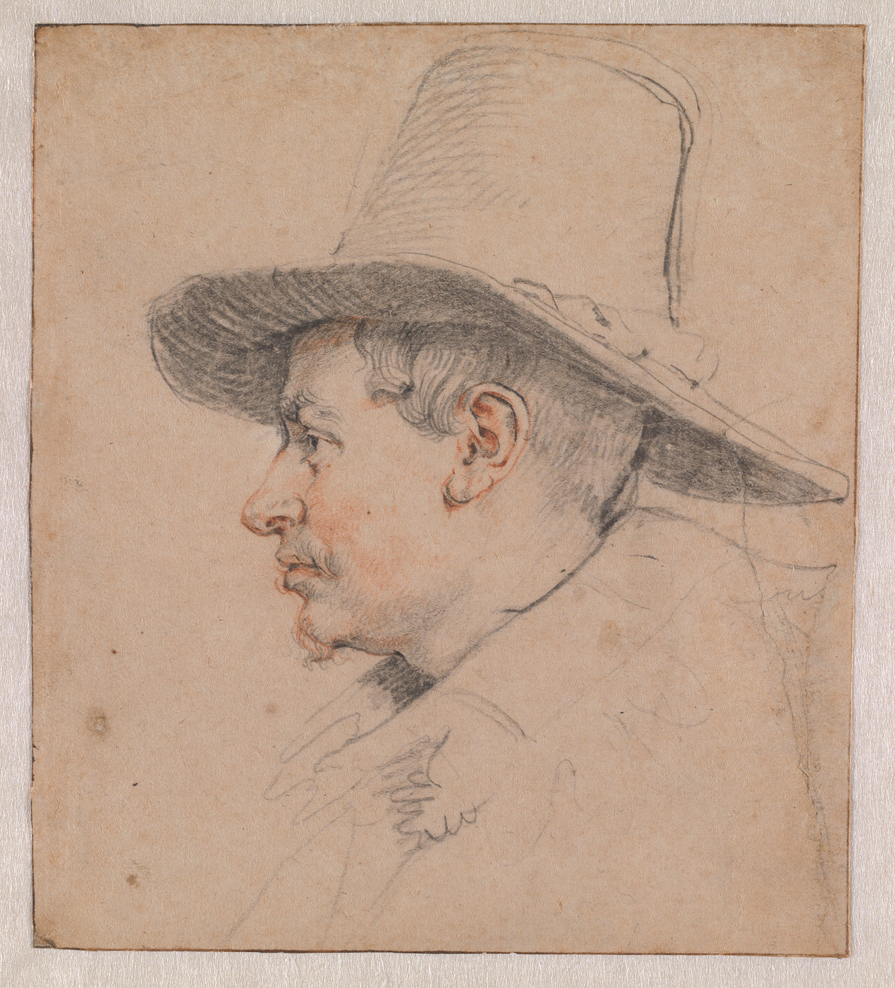 Veiling Walraven 1765, p. 116, Konstboek N, nr. 780: 'Anthony van Dyk. Een Mans Tronie in Profiel te zien, hebbende op zyn Hoofd een hooge Hoed, uitvoerig met rood en zwart Kryt op wit Papier' (f 24:-:-); Veiling Ploos van Amstel 1800, p. 8 Kunstboek B, nr. 29: 'Het pourtrait van den Kunstschilder J. van Goyen, met rood en zwart Kryt, door A. v. Dyk' (f 35:-:-, aan Goll); Veiling Goll van Franckenstein 1833, p. 99, Kunstboek AA, nr. 1: 'Jan van Gooijen. Heerlijk fraai met zwart en rood krijt; door ANTH. VAN DYK' (f 61,-); Veiling Verstolk van Soelen 1847, p. 12, Livre B nr. 62: 'Du Même (Anthonie van Dijck). Portrait du peintre Jean Joseph van Gooyen, d'un beau fini, et dessiné à la sanguine et à la pierre d'Italie. Il est gravé par Ploos van Amstel, et fait partie de son ouvrage' (f 332,-, aan Brondgeest); Collectie C.J. Fodor, legaat 1860