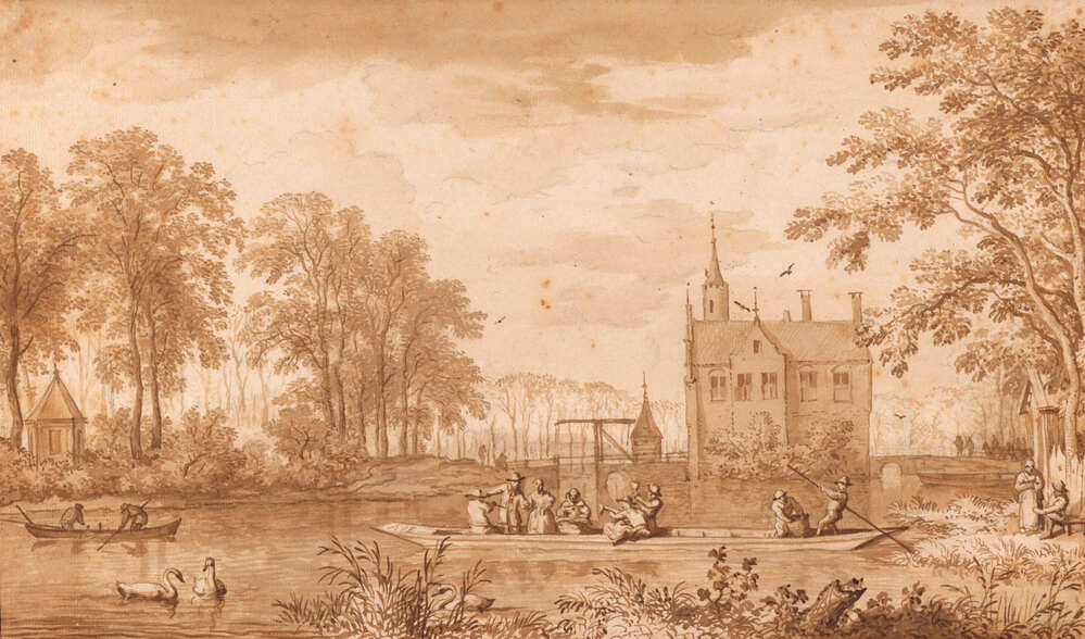 Veiling Feitama 1758 p. 61, Letter I, nr. 18: 'Een dito (landschap), verbeeldende een muziceerend Gezelschap, by Oud Heemstede: h. 7, br. 11 ½ d.' (aan Goll van Franckenstein); Veiling Goll van Fanckenstein 1833, p. 13, Kunstboek C, nr. 12: 'Gezigt op een adellijk slot, omgeven van eene breede gracht, in welke men een pont met heeren en dames en verder stoffagie ziet, Uitvoerig behandeld, als voren (met bruine inkt), (f 135,- , aan De Vies); Veiling Mendes de Léon 1843, p. 8, Kunstboek C, nr. 10: ' Gezigt op de gracht eener Hofstede, omgeven met geboomte; in het midden eene overvarende pontschuit met een vrolijk gezelschap; mede uitmuntend fraai behandeld, als voren (met bruine inkt)' (f 140,- , aan Engelberts); Collectie C.J. Fodor, legaat 1860