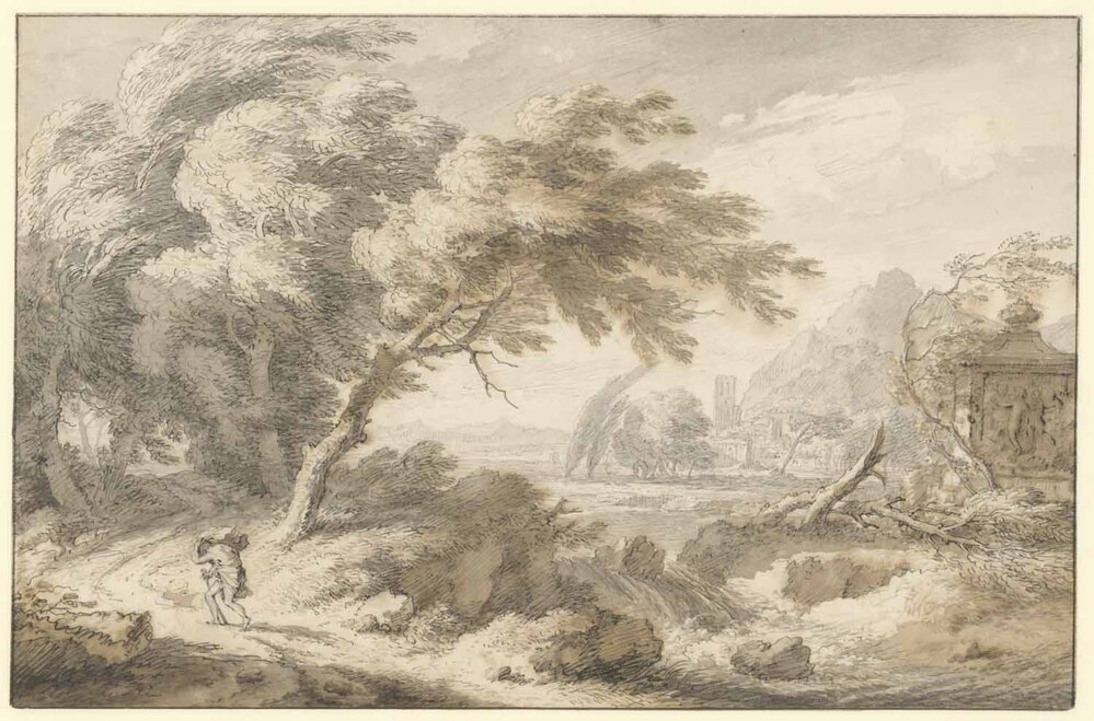 Voor dit landschap bij storm is Van Huysum zeer waarschijnlijk ge‹nspireerd door een prent van de laat 17de-eeuwse kunstenaar Johannes Glauber (1646-1726), die wat compositie betreft grote gelijkenis vertoont (afb. a). Jan van Huysum bracht dit thema vaker in beeld. In Teylers Museum te Haarlem bevindt zich bijvoorbeeld een tekening met een stormachtig landschap bij onweer. ( Ingrid Oud)