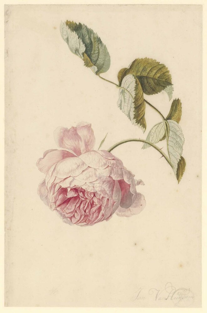 De toeschrijving van deze minutieus getekende koolroos aan Jan van Huysum kan niet langer blijven gehandhaafd. De ogenschijnlijke standaard signatuur van Van Huysum is niet eigenhandig. Een verwante roos komt niet voor in ander werk van deze kunstenaar. Er zijn overigens nauwelijks studies van losse bloemen en planten bekend, die thans met zekerheid aan Van Huysum worden toegeschreven. Toch is het heel goed mogelijk dat hij losse studies maakte ter voorbereiding van zijn schilderijen, want het direct naar de natuur schilderen van alle bloemen is een omslachtige werkwijze.