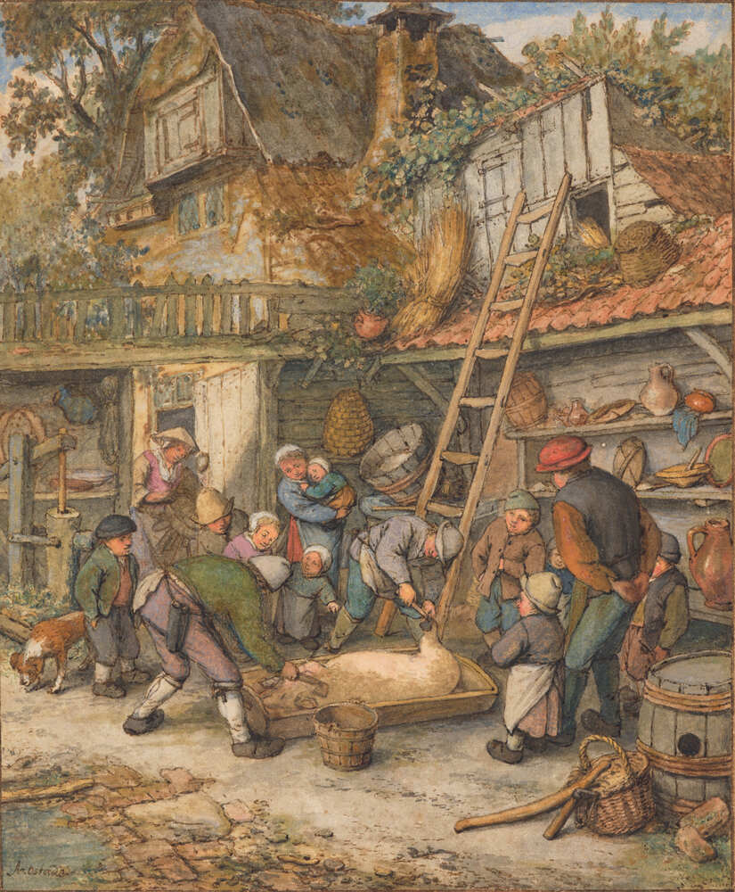 Collectie Van Huls (in Veiling Van Huls 1736, p. 53-55, Portefeuille GG, nrs. 1757-1848 komen slechts vage omschrijvingen voor, zoals 'Pièces de Paisans') ; Veiling Huquier 1761, p. 51, Letter E, nr. 538: 'Een voorwerp van dertien Boeren voor de Deur staande, alwaar een Varken word geslagt, met smaak geteekend en gekleurd als de vorige, door den zelven (Adriaen van Ostade) uit het zelve Kabinet (Van Huls)' Veiling Gildemeester 1800, p. 139, Konst-boek Q, nr. 1: 'Op een Boere-werf, ziet men twee slachters een Varken, in het trog leggende, schraapen, daar nevens staat een Boertje met aandacht naar 't zelve ziende, verzeld van verscheide kinderen, een vrouw met een kind op den arm, en een ander de deur inkomende, verder een boere-woning by geboomte, gestoffeerd met verscheide bywerk, alles vewonderlijk, natuurlijk, zonachtig en uitvoerig met de pen en sapverwen geteekend; door A. van Ostade' (f 200,- ,aan C. Parijzenaar H.); Veiling Willink 1819, p. 1, Kunstboek A, nr. 2: 'Een Buitenhuis, alwaar twee lieden bezig zijn een geslagt varken te schrapen, hetwelke door een daarbij staand man en verscheidene jongens wordt beschouwd, tegens de schutting staat een meisje met een kind in den arm, en door de deur komt eene vrouw met een hakblok aandragen; dit teekeningetje, bekend onder den naam van het verkenslagertje, is van de geestigste en dunste met sapverwen, door denzelven (Adriaen van Ostade)' (F 300,- ,aan Roos van Baartz); Veiling Baartz 1860, p. 12, Livre O, nr. 299: ' A. van Ostade. Dans la cour d'une ferme deux hommes sont occupés ave un porc, ils sont entourés de plusieurs spectateurs, hommes et enfants; au fond une porte par laquelle entre une femme, et d'où on voit l'entrée de la maison, dont s'élève le pignon au-dessus du mur d'enceinte qui renferme cette groupe de treize personnes. Contre un hangar à droite est appuyé une échelle, qui conduit à une lucarne sur le toit, autour de laquelle s'élance une vigne. Un chien et divers ustensiles de ménage enrichissent cette charmante composition. Aquarelle' (f 250,- , aan Lamme voor Fodor) ; Collectie C.J. Fodor, legaat 1860