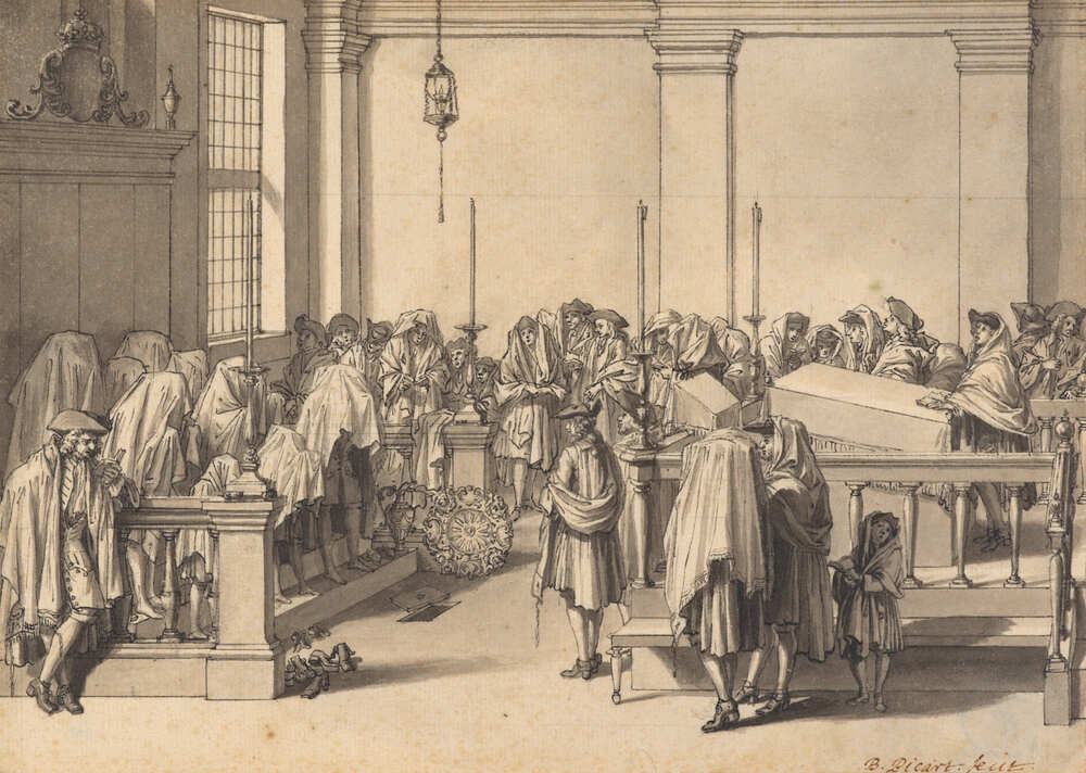 Picart heeft zijn ontwerpen langzamerhand bij elkaar vergaard; in de jaren 1721-1725 werkte hij bijvoorbeeld aan de illustraties met joodse ceremoni‰n. Omdat hij goed op de hoogte moest zijn van de gebruiken zal hij zich veelvuldig in joodse kringen hebben bewogen. Op de illustratie van het feest Vreugde der Wet (cat. nr. 129) is de oostwand van de Amsterdamse Portugese synagoge met de Ark afgebeeld. Twee voorgestelde interieurs vertonen zo'n grote gelijkenis met die van de Portugese synagoge (cat. nrs. 123 en 127) en ‚‚n met die van de Obbene Sjoel (cat. nr. 124), dat deze als zodanig zijn ge‹dentificeerd. Picart heeft ook schetsen in Den Haag gemaakt. Bij twee prenten staat vermeld dat ze in de Portugese synagoge in Den Haag zijn gesitueerd (cat. nrs. 121 en 122).