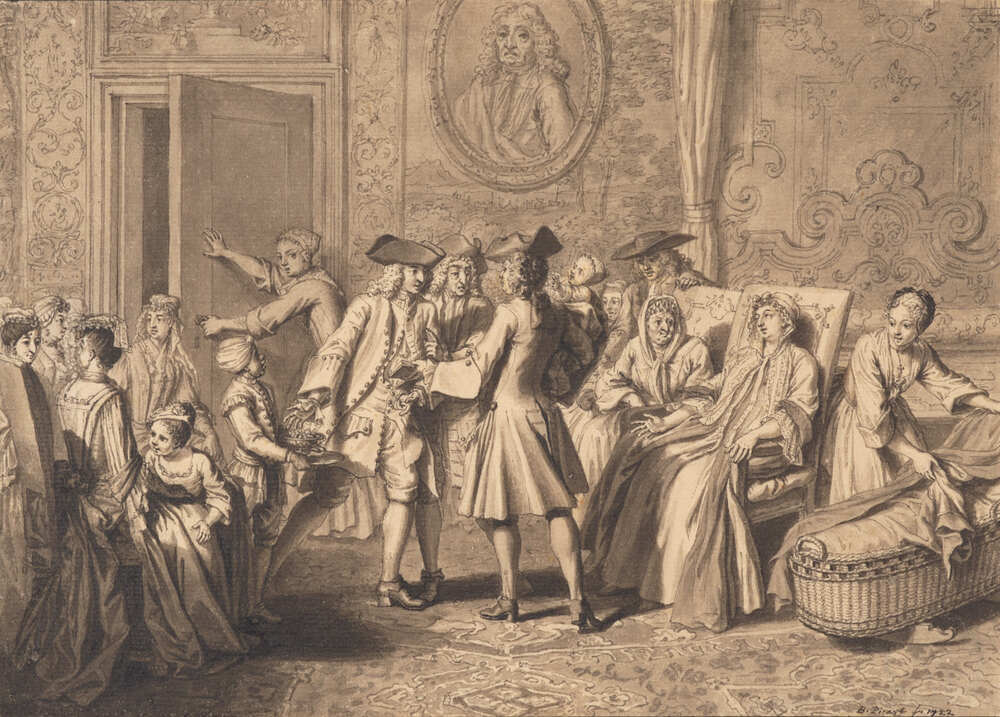 Picart tekende het moment dat de vader onderhandelt met een Kohen die het kind op zijn arm houdt (afb. a). De moeder zit rechts in een stoel toe te kijken. Naast haar staat het kindermeisje dat christelijk is, gezien het kruisje om haar hals. Familieleden en vrienden wonen eveneens de ceremonie bij, die plaatsvindt in een rijk gedecoreerde kamer met tapijten, wandbetimmeringen en kamerbehangsels. Het kraambed staat nog in de woonkamer opgesteld (rechts op de achtergrond), wat in die tijd gebruikelijk was na de geboorte van een kind. Over de behangselschildering hangt een groot mansportret. Het portret lijkt op de man die tussen de vader en de Kohen in staat. Hij zou daarom het hoofd van de familie kunnen zijn.