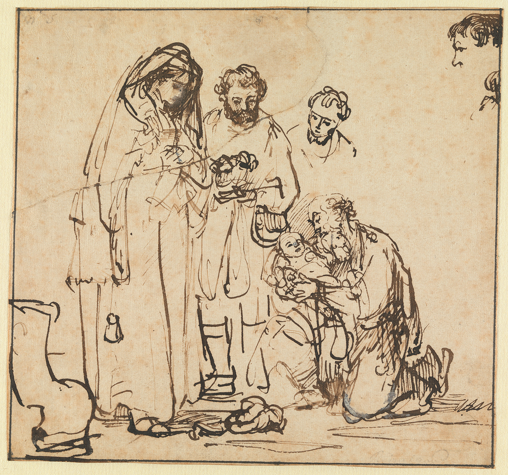 (?) Veiling Ploos van Amstel 1800, p. 44, G 20 :'Simeon in de Tempel, liggend geknield en houdende het kind Jesus in de Armen, waarby Maria, en Joseph, benevens nog eenige Beelden zig vertoonen; krachtig met de pen in Roet, door Rembrandt' (f 95,-, Roos); (?) Catalogus Van eene … verzameling gekleurde en ongekleurde teekeningen … nagelaten door wijlen den wel-ed. heer Johannes Andreas Jolles, Amsterdam (J. de Vries e.a.) 27 november 1848, p. 22, nr. 199: 'Rembrandt van Rhijn. Simeon in den Tempel, houdende het kind Jezus op den arm, waarbij Maria en Jozef, benevens nog eenige beelden; fraai van karakters en eene voortreffelijke behandeling, met roet' (f 72,-, Brondgeest); Veiling Baartz 1860, p. 10 nr. 226: 'Rembrandt van Rijn. Siméon au Temple. A la plume' (f 6,-, Lamme); Legaat C.J. Fodor 1860