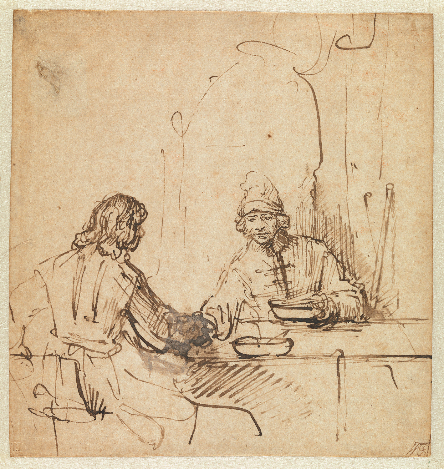 Th. Dimsdale (1758-1823); Th. Lawrence (1769-1830); W. Esdaile (1758-1837); Veiling Esdaile 1840, p. 10 nr 94: 'Rembrandt van Rijn. Esau selling his birthright, nr. 59; very spirited, from the Collection of T. Dimsdale, Esq.' (£ 5,-, met nr. 93 samen, Hodgson voor Brondgeest); (?) Cat. Catalogus van een uitmuntend fraai kabinet gekleurde en ongekleurde tekeningen… (Mendes de Léon) Amsterdam (J. de Vries, e.a.) 20 november 1843 e.v.d., p. 17 nr. 6: 'Esau, zijn geboorterecht aan Jacob verkoopende; breed met de pen' (f37,-); (?) Veiling Vertolk van Soelen 1847, p. 8, nr. 37: 'Du Même (= Rembrandt van Rhyn). Deux hommes dont l'un, vu sur le dos, est assis à une table; dessin exécuté à la plume`(f 181,-, Brondgeest) ; Legaat C.J. Fodor 1860