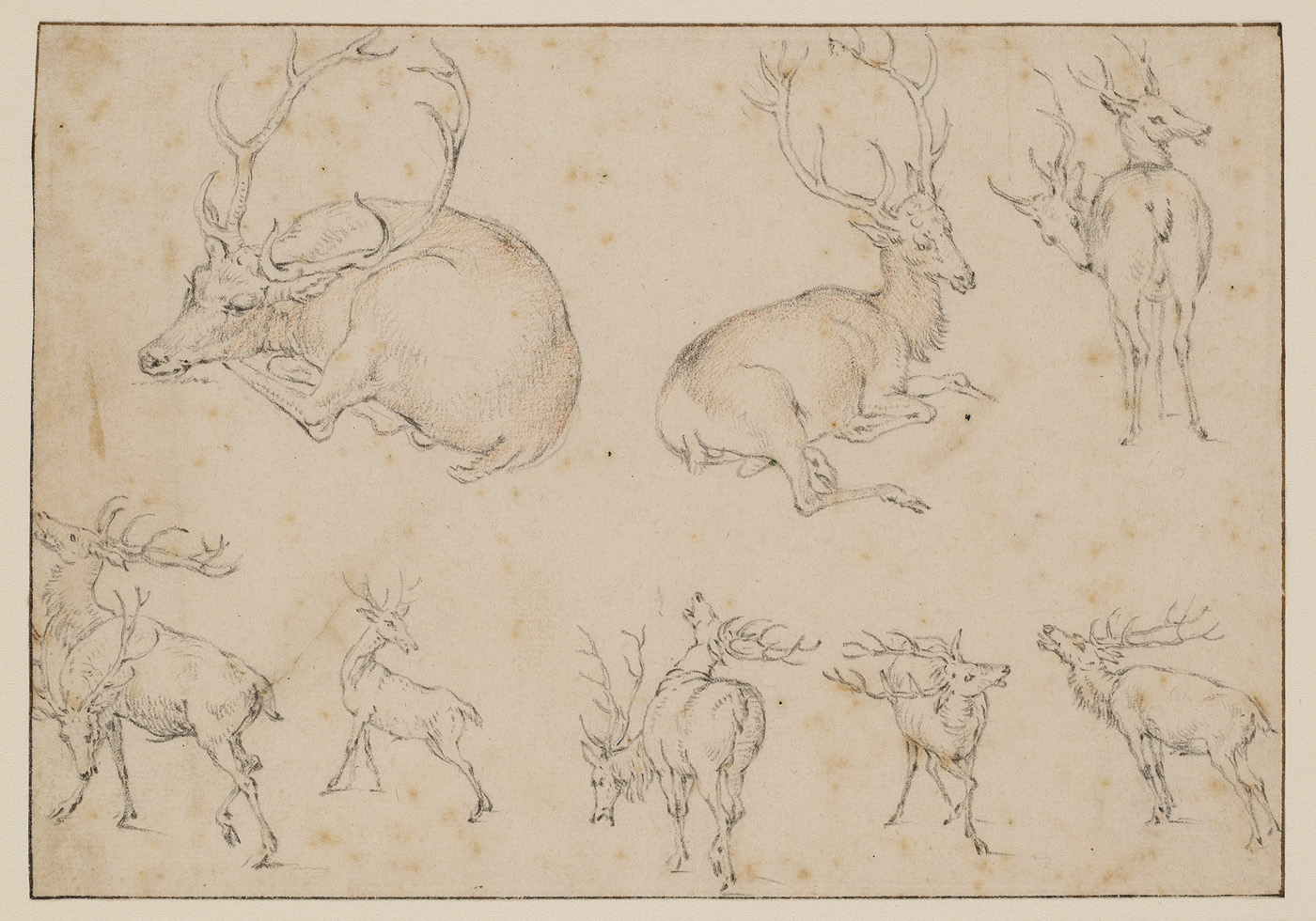 De Vlaamse kunstenaar Roelant Savery gebruikte dit type studiebladen bij de aankleding van zijn landschappen. Het hert is in vele houdingen weergegeven.