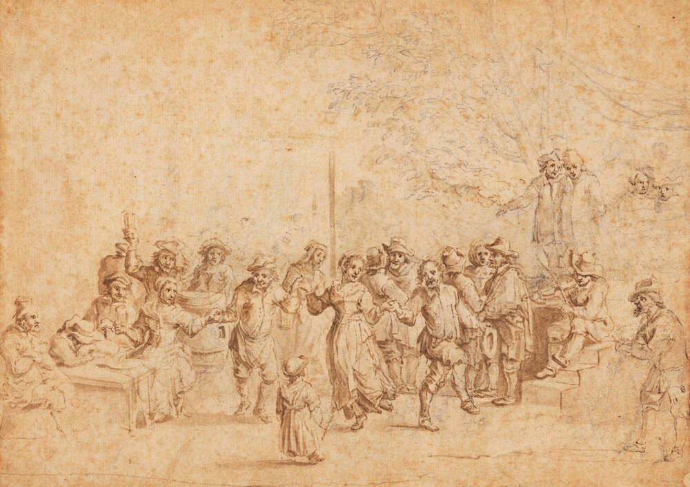 Veiling Goll van Franckenstein 1833, p. 54, Kunstboek N, nr. 11: 'Een boeren Kermis, vol gewoel van vrolijke personen. Als voren (geestig voorgesteld), met de pen in bruine inkt, door DAVID TENIERS' (f 36,-,aan Brondgeest); Collectie C.J. Fodor, legaat 1860