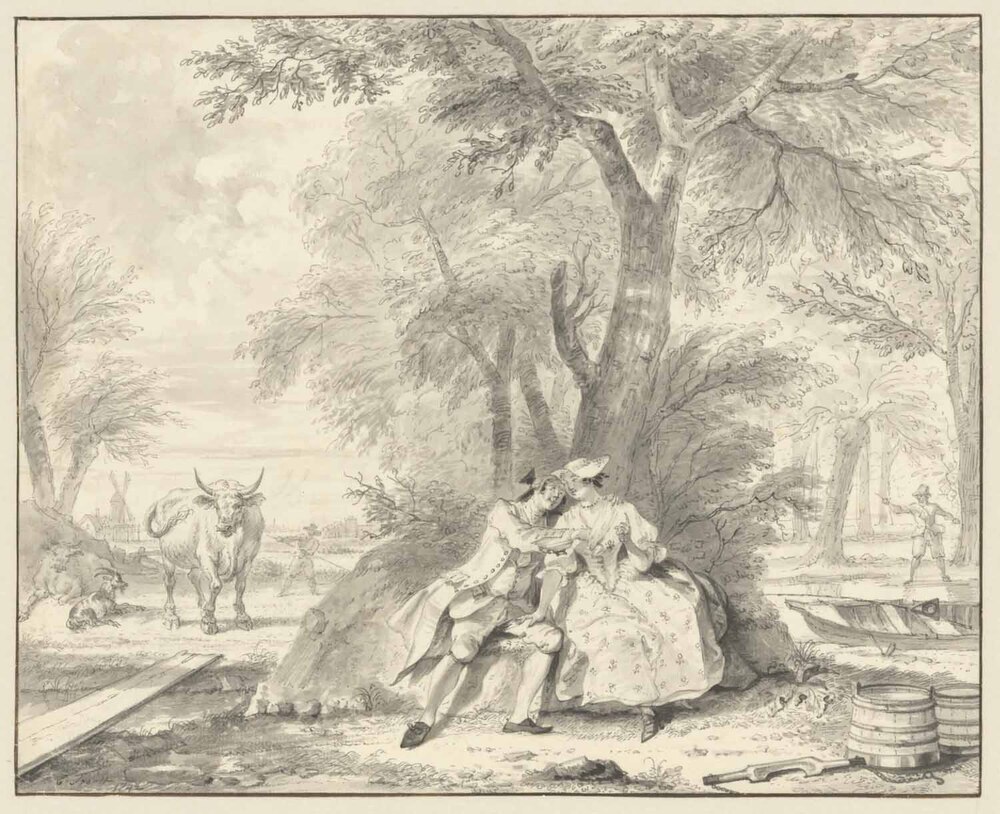 De steeds geklede jongeman is aan het vissen geweest. Zijn driekante steek ligt nog in het bootje naast de hengel. Deze hengel, of het vissen, verwijst tevens naar de ontluikende liefde tussen het paartje. Met het werkwoord vissen werd ook wel het liefdesspel zelf aangeduid. Op de achtergrond staat een man, wellicht de vader of de aanstaande van het meisje, die de aandacht probeert te trekken. Het lijkt op een thema voor een kluchtspel, zoals Troost er vele in beeld heeft gebracht. ( Leonoor van Oosterzee)