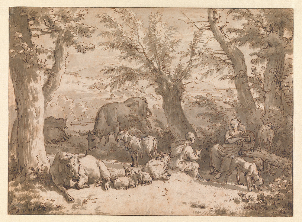 Veiling Goll van Franckenstein 1833, p. 69, Kunstboek R, nr. 5: 'Adriaan van de Velde. In een boomrijk Landschap zit een man, sprekende met eene vrouw; op den voorgrond koeijen, schapen en een hond. Met de pen in bruine inkt breed en geestig voorgesteld' (f, 670,-, aan Claussin); Veiling De Claussin 1844, p. 26-27, nr. 79: 'Du même (Adriaan van de Velde), Le repos des champs. Vers le milieu du second plan, sous l'ombrage de grands arbres, un homme assis, et vu de profil, s'entretient avec une femme également assise à droite ; dans le fond, deux vaches, dont une broute; sur le devant, un groupe de mouton près d'une autre vache couchée au pied de deux gros arbres, à gauche du premier plan; au dessous, de se côté, sur le terrain, la signature du maître. Ce beau dessin, d'un effet brillant, est à la plume et lavé à l'encre de la Chine mêlée de bistre. H. 17 c. 1m, L. 23 c. 3 m.' (fr. 1365,- aan B = Buffa ?); Collectie C.J. Fodor, legaat 1860