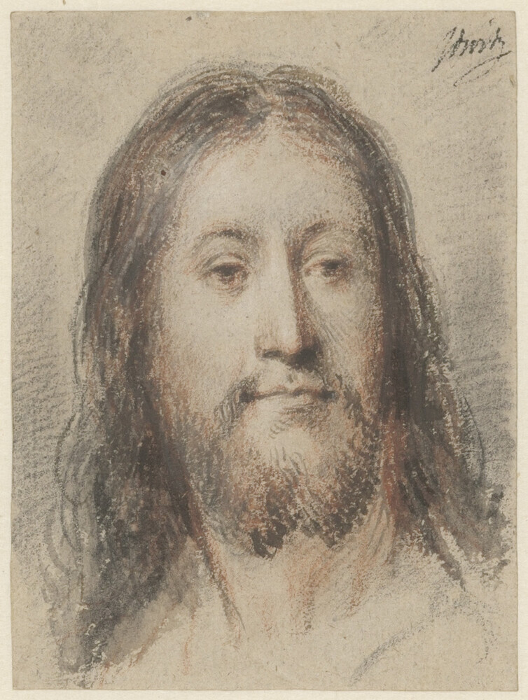 De tekening waar Christus en face is weergegeven, is verwant aan een paneel dat zich in Delft bevindt. Hetzelfde type hoofd zien we ook in diverse tekeningen en schilderijen met de Verrijzenis van Christus: golvend haar tot op de schouders, een korte baard met een scheiding en een lange rechte neus.