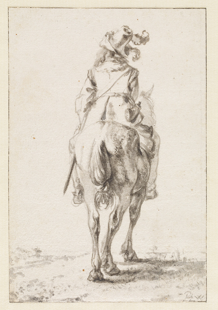 Collectie V. Röver (1686-1739); Veiling Goll van Franckenstein 1833, p. 97, Kunstboek Z, nr. 15,: 'Een krijgsman, zittende te paard, van achteren te zien. Met zwart krijt en o.i. inkt, door PH. WOUWERMAN' (f 10,- aan De Vries); Veiling De Vries 1853, p. 30, Kunstboek E, nr. 143: 'Ph. Wouwerman. Een Ruiter te paard, van achteren te zien'(f 25,50, aan Lamme); Collectie C.J. Fodor, legaat 1860