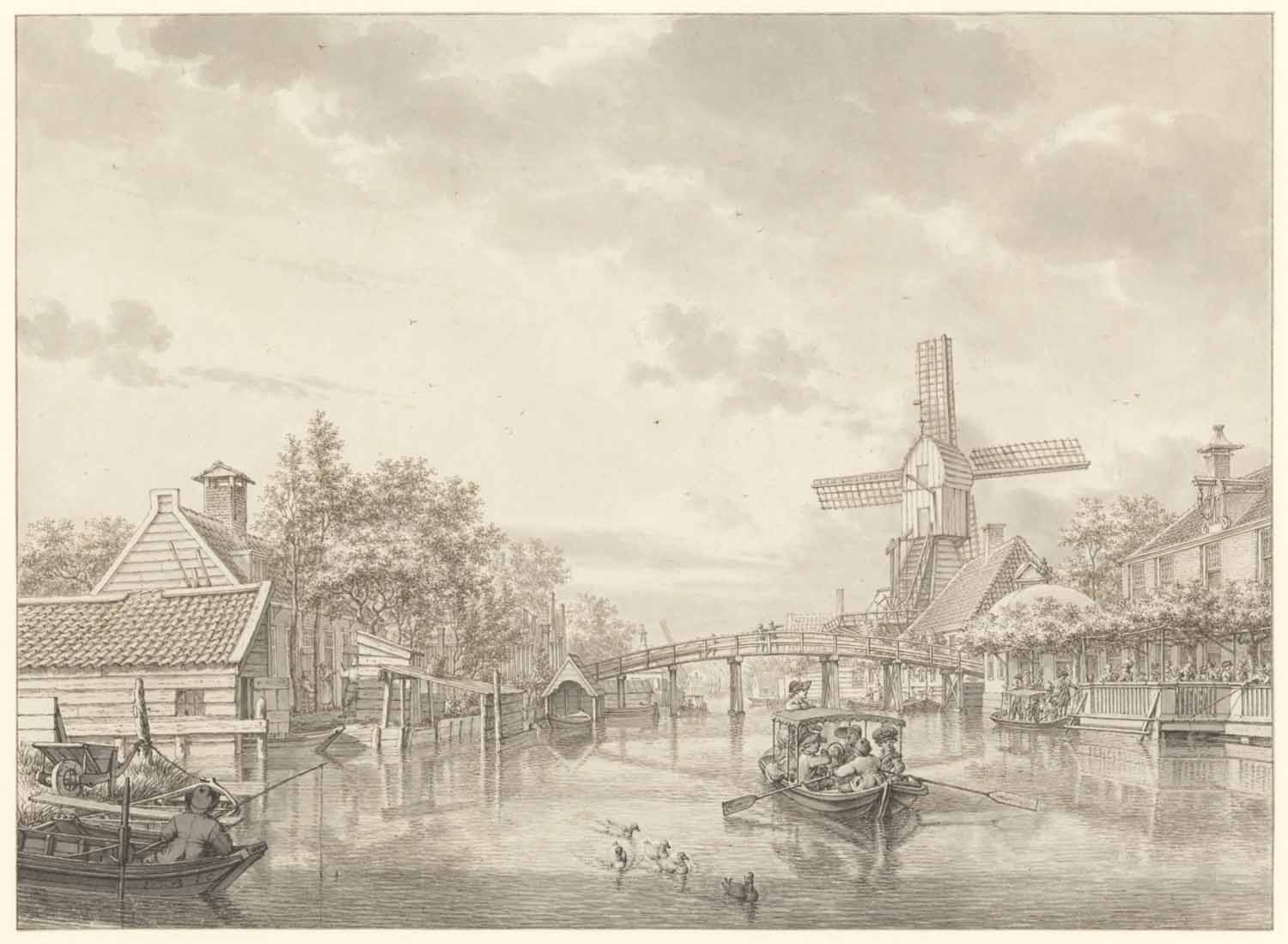 Vanaf het water van de Boerenwetering kijken we in de richting van de stad naar de overhaal bij de Weteringspoort, zoals blijkt uit Cats' annotatie op de achterzijde van de tekening. Rechts ligt de door Amsterdammers druk bezochte herberg Stadlander met het terras aan het water. In het midden de Hooge Brug en meer naar achter een wipstellingmolen, waar loodwit werd gefabriceerd. De overhaal tussen Boerenwetering en Mennonietensloot is in de verte nog net te zien.