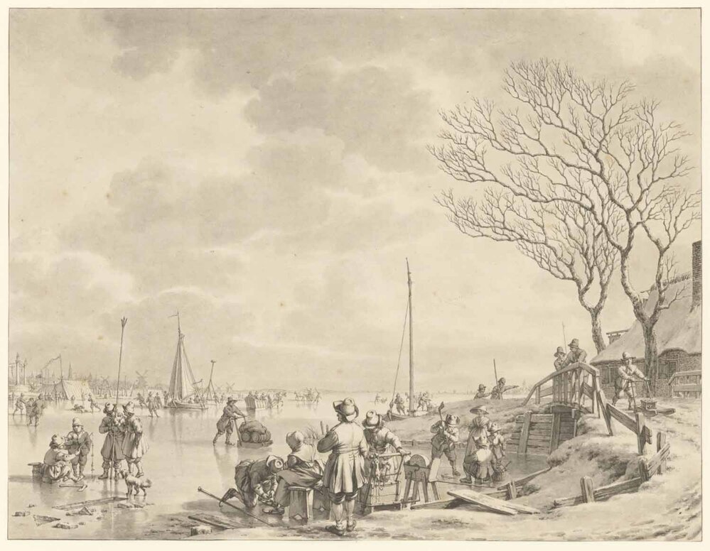Veiling Elzer, Amsterdam, 11 november 1845, Kunstboek A, nr. 45: 'J. Cats. Eene bevrozene Rivier, rijk gestoffeerd met sleederijders en onderscheidene groepen bij elkander staande personen, wandelaars, schaatsenrijders, een ijsschuitje benevens verdere stoffagie. Zeer fraai en uitvoerig met dito [o.i. inkt].' (f 150,- aan Fodor); Collectie C.J. Fodor, legaat 1860