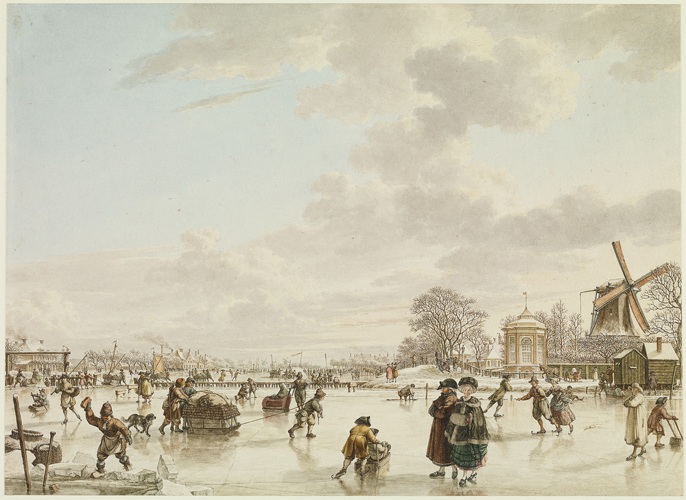 Cats heeft hier een winters gezicht op de Buiten-Amstel afgebeeld, gezien naar het zuiden vanuit de Amsteljachthaven. Die was gelegen bij het bolwerk Westerblokhuis en de Hogesluis, ter hoogte van de huidige Sarphatistraat. Het koepeltje rechts staat in de tuin van de buitenplaats Amstelhoek. De molen erachter is De Zeskant, de eerste molen aan het Zaagmolenpad. Links de Amstelbomen, een rij palen in het water met twee poortvormige openingen, die 's nachts voor het waterverkeer werden afgesloten.