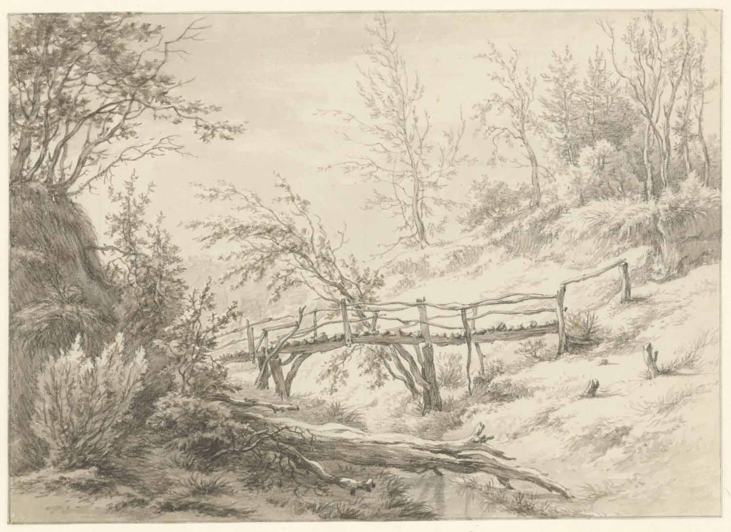 De kleine Zwitserse brug in het park van het huis Elswout te Overveen, 1796 papier, O.I. inkt, inkt, krijt, potlood hoogte a: 26.7 cm; breedte a: 37.3 cm; hoogte: 26.4 cm; breedte: 37.1 cm; signatuur/datering verso, links onderaan: E. van.Drielst 1796