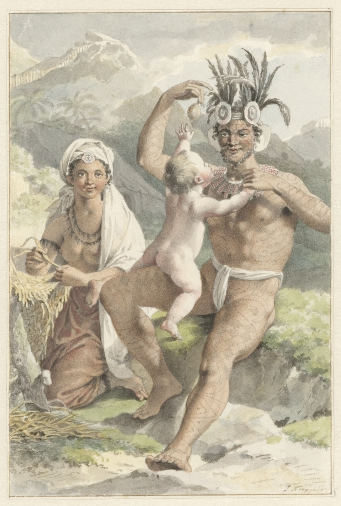 Deze tekening staat bij het hoofdstuk ‘Marquisen-eilanden,’ in het tweede deel van Stuarts serie. Afgebeeld zijn een vrouw die een mat weeft en een man met een kind op schoot – opvallenderwijs is het kind wit, met blond haar, terwijl de twee volwassenen zwart haar en een getinte huid hebben. De drie zijn gezeten in een rotsachtig landschap, met op de achtergrond een berg. Hoewel de begroeiing op de voorgrond vrij schaars is, is op de achtergrond een donker woud te zien, met een paar uitstekende palmbomen. Een deel van de lucht wordt gevuld door een grote rookwolk, die uit het bos voor de berg lijkt te komen. De scène speelt zich af in de Marquesaseilanden, die in de Stille Oceaan liggen en deel uitmaken van Frans-Polynesië. Stuart heeft zijn beschrijving gebaseerd op het reisverslag van de Britse zeeman James Cook (1728-1779), die drie grote ontdekkingstochten in de Grote Oceaan maakte in de achttiende eeuw. In 1777 publiceerde Cook A Voyage Towards the South Pole and Round the World, waarin hij onder meer zijn bezoek aan de Marquesaseilanden beschrijft. Stuart, die zelf niet op ontdekkingsreizen was gegaan, haalde zijn informatie altijd van andermans beschrijvingen, en in het geval van de Marquesaseilanden berust zijn verslag vrijwel geheel op dat van Cook – al maak hij soms ook gebruik van James Wilsons (1760-1814) A Missionary Voyage tot he Southern Pacific Ocean uit 1799.