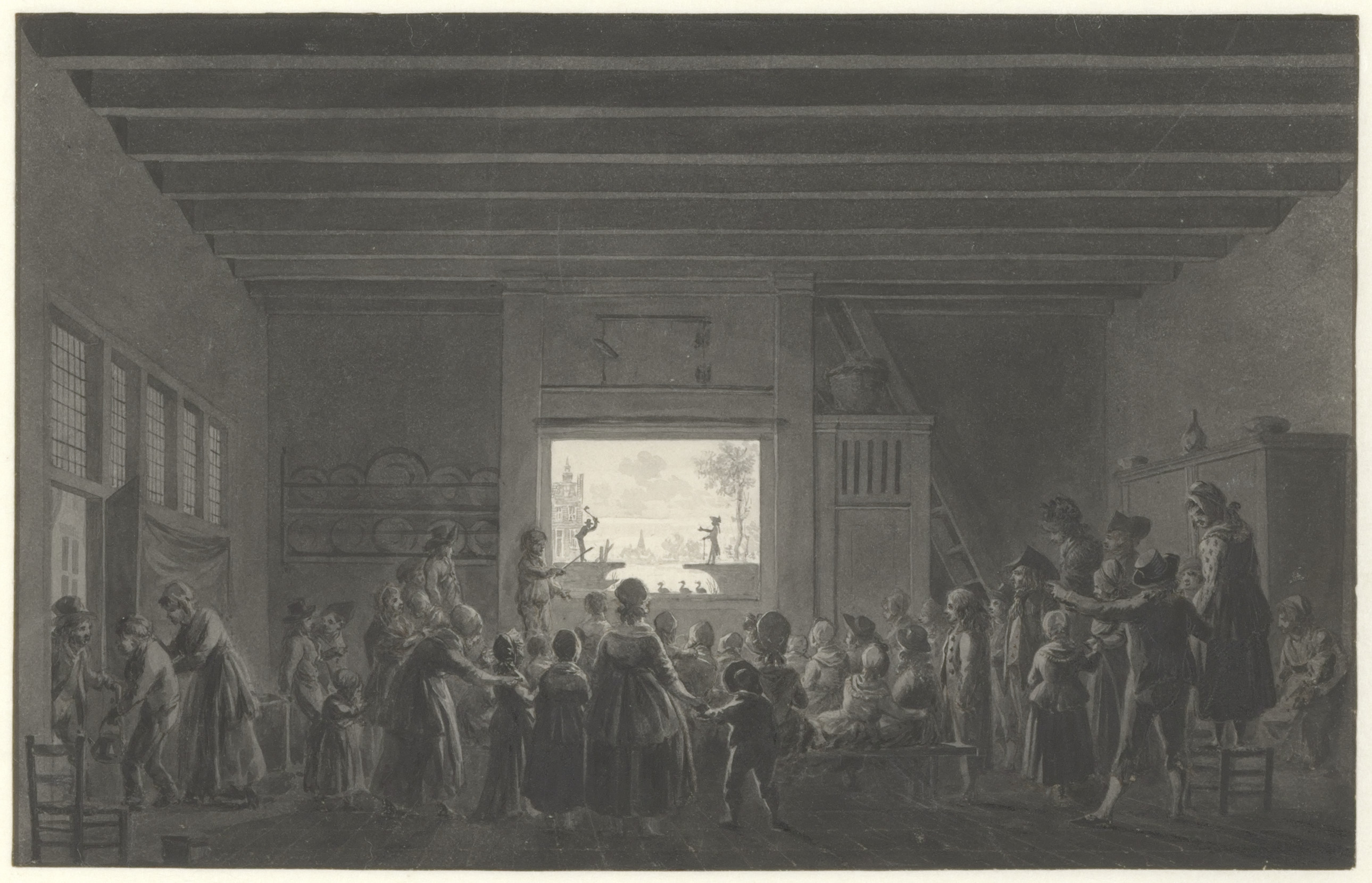 Op deze donkere scène beeldt Langendijk mensen af, kijkend naar een schimmenspel. Vooral kinderen lijken van de voorstelling te genieten, terwijl een aantal volwassenen de scène overziet. Het schimmenspel, een vorm van poppenkast waarbij figuren als donkere silhouetten tegen een lichte achtergrond worden geplaatst, werd tussen 1772 en 1870 gepopulariseerd door Le Théâtre Séraphin, een Franse theatergroep. In die tijd kwam de theatervorm ook naar Nederland, waar mensen zowel thuis als buitenshuis schimmenspellen gingen spelen. Langendijk gebruikt het schimmenspel hier op zijn allegorie voor het gezicht. Net als op Het gehoor uit dezelfde reeks combineert hij het aloud bekende thema van de moraliserende reeks hier met een moderne allegorische betekenis: voor de contemporaine kijker was het schimmenspel een herkenbare, populaire activiteit. Op zintuigenreeksen uit eerdere eeuwen, zoals het beroemde voorbeeld van Jan Brueghel I (1568-1625) en Peter Paul Rubens (1577-1640), werd het Gezicht veelal verbeeld door middel van een figuur te midden van schilderijen en andere bezienswaardigheden. In andere gevallen werd het onderwerp verbeeld middels een vrouw met een spiegel. Door dus geen klassiek, maar juist een uitdrukkelijk hedendaags onderwerp te kiezen voor zijn allegorische voorstelling van het gezicht, plaatst Langendijk zich zowel binnen als buiten de artistieke traditie.