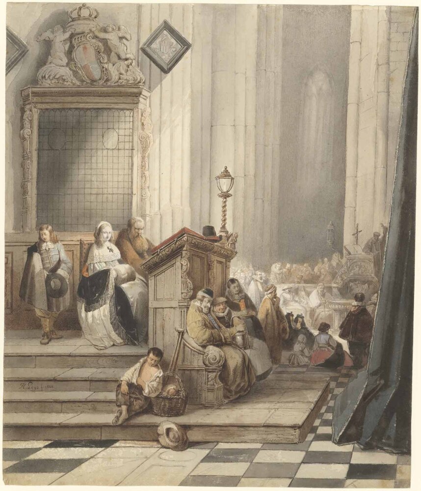 - Eene kerk van binnen met vele beelden 17e eeuws kerkinterieur, 1844