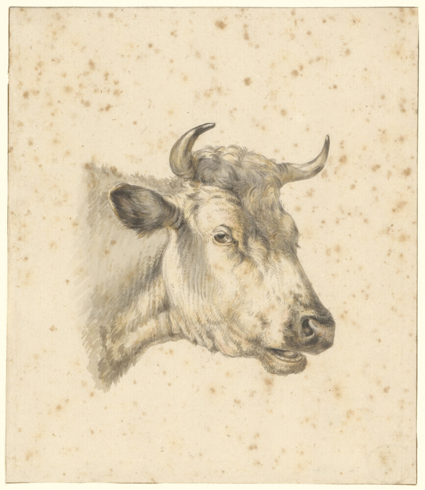 Pieter Gerardus van Os (1776-1839) leerde van zijn vaderde bloemschilder Jan van OS (1744-1808), het vak van kunstenaar. Op negentienjarige leeftijd verhuisde hij van Den Haag naar Amsterdam, waar hij zich bezig ging houden met het vervaardigen van miniatuurportretten. Zijn voorkeur lag echter bij het schilderen van landschappen en vee, vaak geïnspireerd door Paulus Potter (1625-1654). De stijl van Van Os houdt het midden tussen de kunst uit de zeventiende- en negentiende eeuw: hij wist elementen van zijn voorbeelden, zoals het veestuk en de weidse luchten, te combineren met de liefde voor natuurgetrouwe landschappen die zijn eigen tijd kenmerkte. Het Amsterdam Museum bezit twee koeienkoppen (inv. nr. TA 10746 & TA 10747) en twee landschappen met vee van Van Os (TA 10749 & TA 16712).