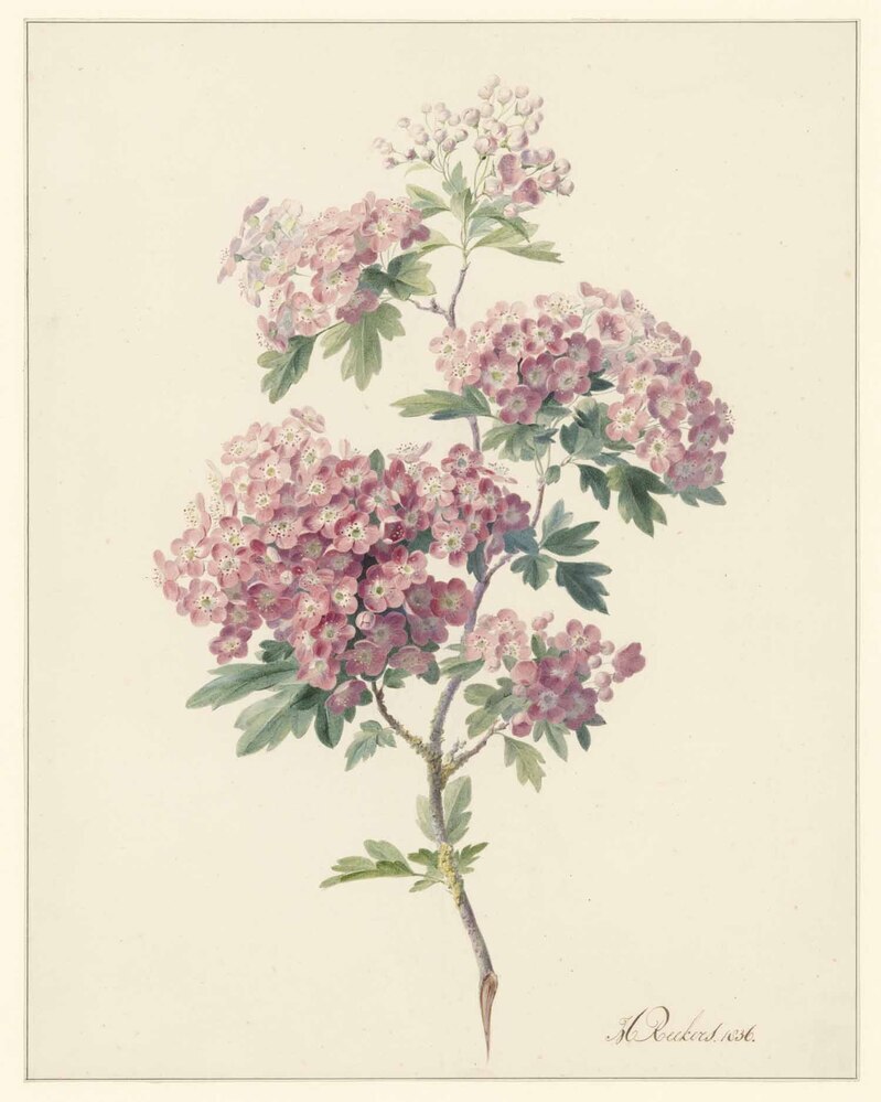 Hendrik Reekers was een leerling van zijn vader Johannes Reekers (1790-1858) en Georgius J.J. van Os (1782-1861). In 1837 vestigde hij zich als tekenleraar in Haarlem. Hij maakte reizen naar Parijs en Brussel, steden waar zijn werk ook verkocht werd. Deze tekening van een bloeiende meidoorn is een voorbeeld van de vernieuwing in de sortering van sierbloemen in de eerste helft van de 19de eeuw. De meidoorn kwam toen weliswaar al voor, maar alleen met witte en niet met purperroze bloemen. ( Bert Vreeken)