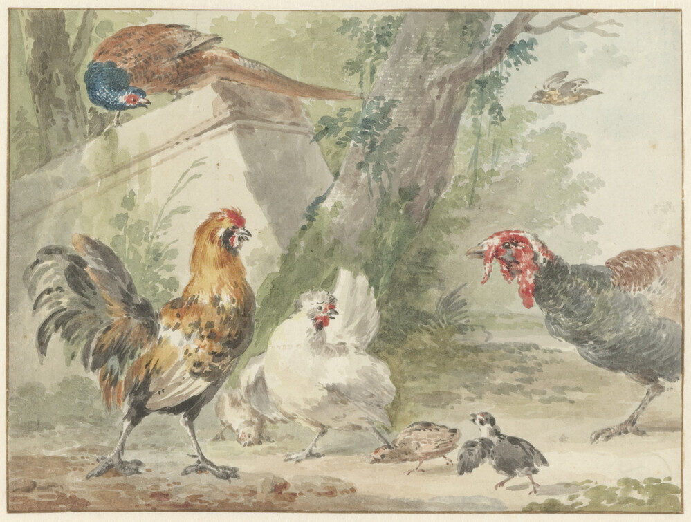 Het motief van een kip die haar kuikens wil beschermen tegen een naderende kalkoen ontleende Schouman aan de geschilderde dierstukken van zijn 17de-eeuwse voorganger Melchior d'Hondecoeter (1636-1695). Een zeer vergelijkbare scŠne met een kalkoen, een kip en kuikentjes komt bijvoorbeeld voor op een schilderij door d'Hondecoeter waarvan Schouman een kopie maakte. Dit motief paste Schouman niet alleen toe in de tekening in het AHM, maar ook in andere vogelstukken. ( Ingrid Oud)