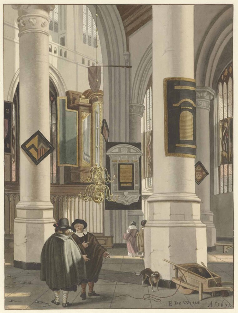 Veiling Jan Stolker, Rotterdam, 27 maart 1786, Kunstboek D, nr. 165: 'Jan Stolker. Een gezigt eener fraaije Kerk, van binnen naar het Orgel te zien, aan derzelve pylaaren hangen verscheide Wapens & c., op de voorgrond twee gemantelde Mans, met elkanderer schynende te spreeken, en een Kruywagen en een Hond; verder een Heer en een Dame; in dit stuk 't welk overhelder en breed is uitgevoerd, speelt een zeer natuurlyk zonligt, na 't Schildery van Em. de Witt, geteekent, hoog 12, breed 9 duim.' (f 61,- aan Van Santen); Collectie C. Ploos van Amstel, Veiling Amsterdam, 3 maart 1800 e.v.d., Kunstboek W, nr. 13: 'Een Protestantsche dito [kerk van binnen], door en naar denzelven [door J. Stolker naar E. de Wit].' (f 61 aan De Groot); Veiling Jan de Groot, Amsterdam, 10 december 1804, Kunstboek D, nr. 22: 'Jan Stolker. Een dito [protestants] Kerk, gedeeltelyk van binnen te zien, naar het Orgel en Choor, gestoffeerd met wandelende Heeren en Dames, verders verscheide Wapenborden en andere Gedenckteekens; het bevallige zonlicht en de uitvoerige behandeling, is kunstig gevolgd in dito [sapverwen] door en naar de voorgaande Meesters [J. Stolker naar E. de Witt].' (f 52,- aan Yver E); Collectie C.J. Fodor, legaat 1860