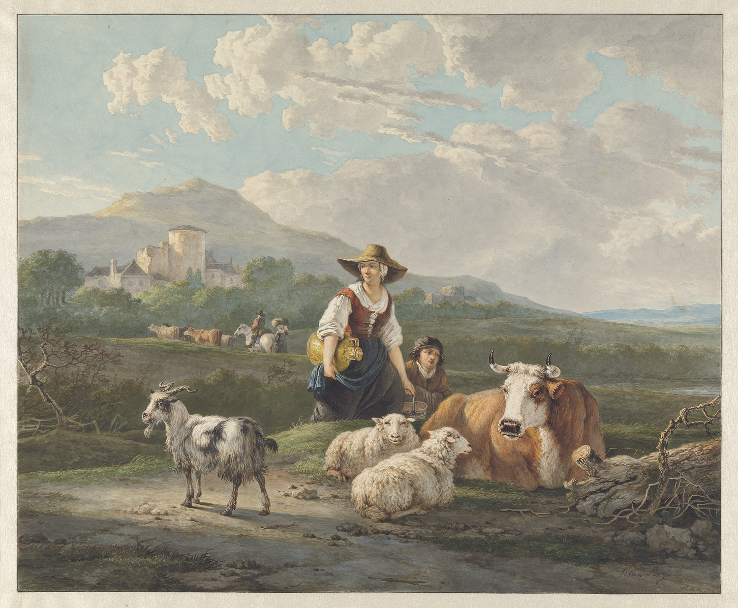 Op deze tekening heeft Van Strij zijn zeventiende-eeuwse voorbeelden gecombineerd met de esthetische idealen uit zijn eigen tijd. Een boerenmeisje loopt door een berglandschap met daarin een kasteel, gevolgd door een jongen. Op de voorgrond bevinden zich een koe, twee schapen en een geit, op de achtergrond drijft een herder op een paard meer koeien voort.