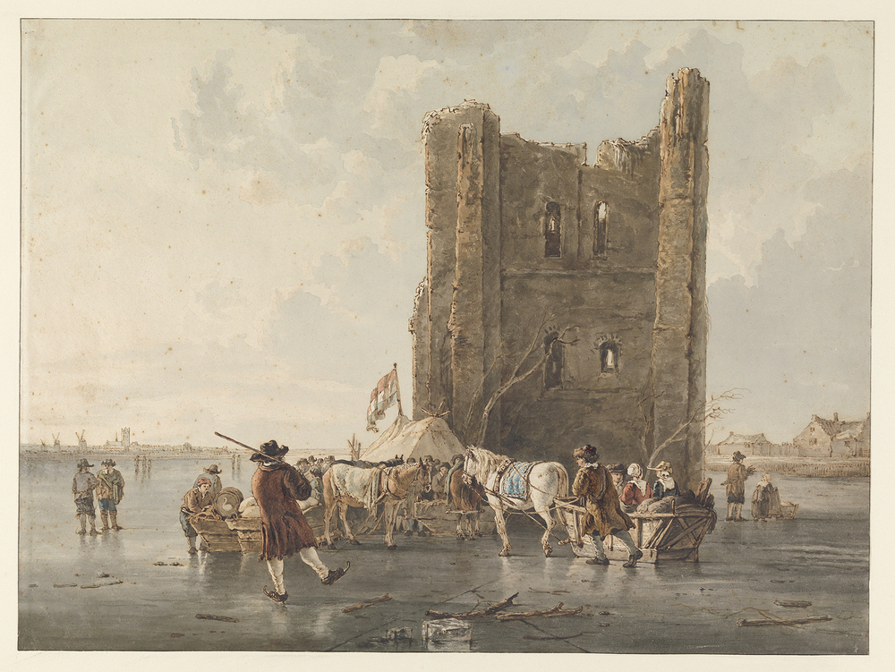 Het huis Merwede was al sinds 1418 verlaten en is in periode daarna tot een ruïne vervallen. De eerste weergave van het bouwwerk is op het St. Elisabethsvloed altaar (1470-1490) in het Rijksmuseum (inv. nr. SK-A-3145/46 en SK-A-3147A/B). In de eeuwen hierna wordt dit herkenningspunt bij Dordrecht veelvuldig afgebeeld, zo ook door Jacob van Strij. Hij voegt echter het element van winterkou toe aan deze scene, waardoor deze tekening een oer-Hollandse uitstraling krijgt. De figuur op de voorgrond draagt schaatsen en rechts achter loopt een meisje met een ondersteuning van een meubelstuk op het ijs. Goederen- en personenvervoer vindt ook plaats op het ijs, zo is te zien dat men in een grote slee zit. Deze staat op ijzers en wordt voortgetrokken door een paard.