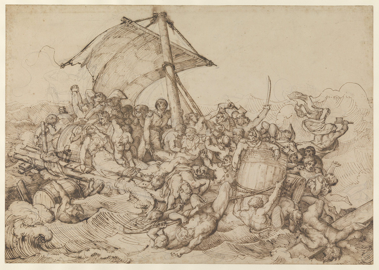 Deze pentekening is een voorstudie voor Théodore Géricaults Het vlot van de Medusa, het werk dat in 1819 een golf van kritiek veroorzaakte in de Parijse Salon. Het gigantische doek schoot bij velen in het verkeerde keelgat; het Frans fregatschip La Méduse was slechts drie jaar eerder verongelukt, vanwege de onkunde van de monarchistische kapitein. De rijken hadden het schip op reddingsbootjes verlaten, met achterlating van 149 mannen en één vrouw, die op een vlot aan de zee werden overgegeven. Vijftien mannen waren nog in leven toen het vlot twee weken later werd gevonden door een ander schip uit hetzelfde konvooi. Ze waren ziek en ondervoed, door wanhoop gedreven tot moord en kannibalisme. Door dit schandaal werd de pas hervatte Bourbonse monarchie op wankele voet gezet. Géricaults schilderij ontstond in de loop van 1818 en ‘19 en het project nam zijn hele leven over: hij schoor zijn hoofd kaal en sloot zich op in zijn atelier met slechts een assistent en menselijke lichaamsdelen uit het mortuarium; hij wilde de stervenden realistisch weergeven. Voordat hij aan zijn doek begon maakte hij meer dan honderd voorstudies,