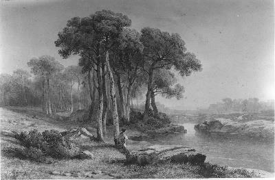 - Een man rust tegen eenen boom, aan den oever van een tusschen rotsen stroomend water, 1844