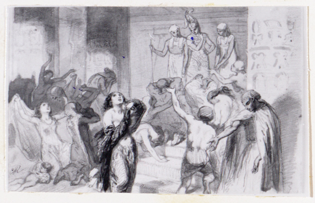 - Een aantal Egyptische vrouwen op de treden van een trap, met hun dode kinderen, in het paleis van de Pharao. De koning, in gezelschap van twee jonge priesters, kijkt naar hen, 1855