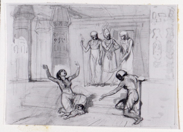 - Op de treden tonen een man en een vrouw met wanhoop hun dode kind aan de koning, die boven op de trap tussen twee magiërs staat, 1855