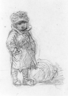 - Jongen met jas en muts naar rechts gekeerd, op de grond een emmer, 1840 - 1881