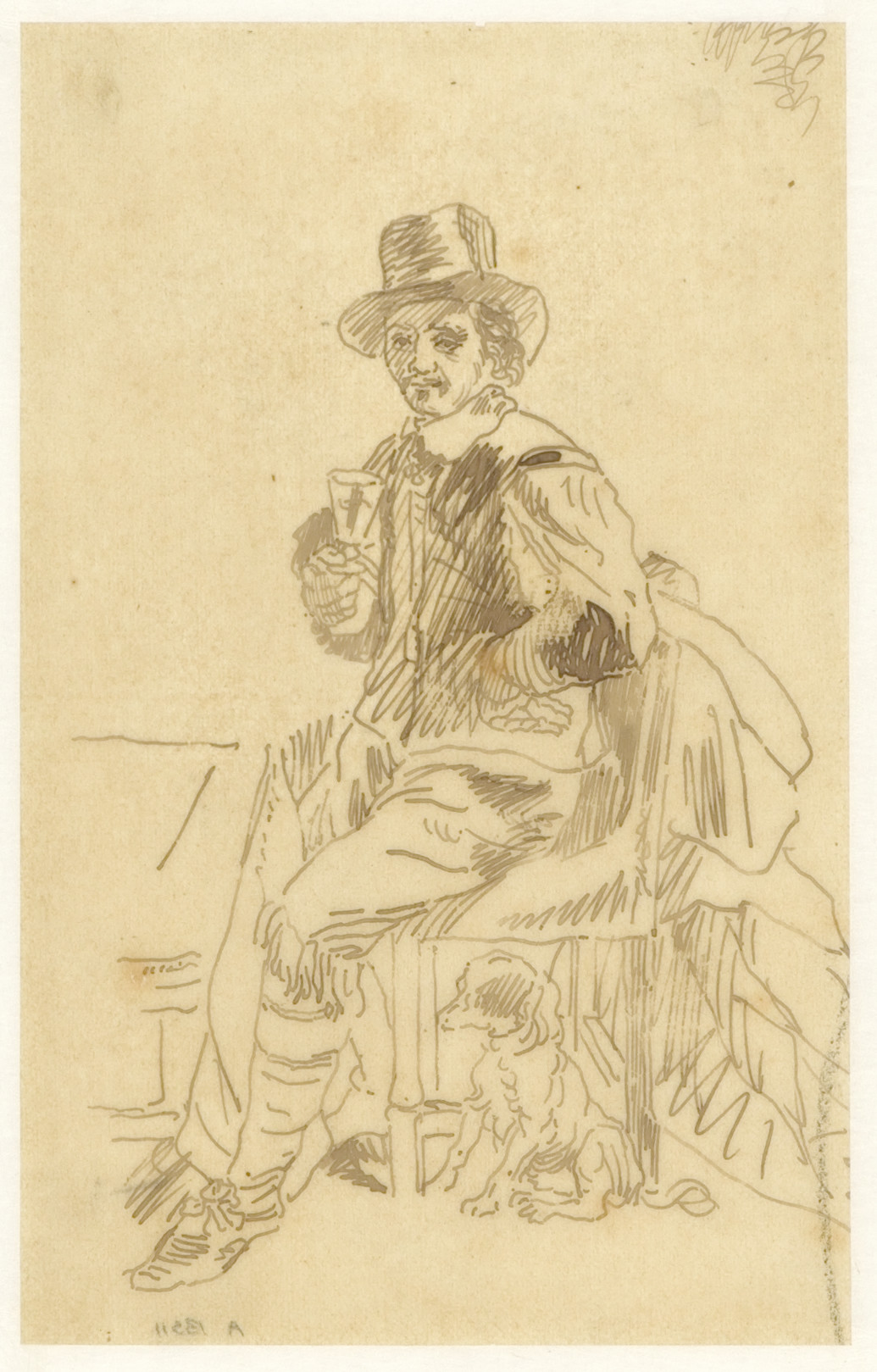 - Op een stoel zittende man in 17e eeuws Holl.kostuum met een glas in zijn rechterhand. Naast de stoel een zittende hond, 1840 - 1881