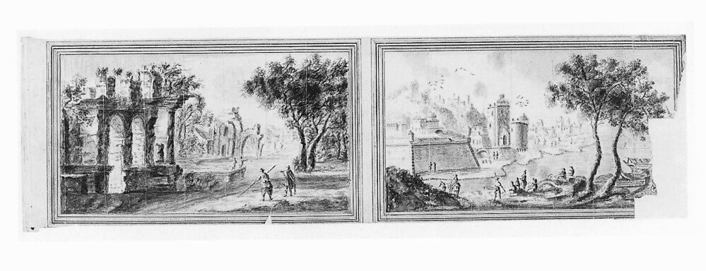 - Landschap met ruïnes; Gezicht op een ommuurde stad, 1772
