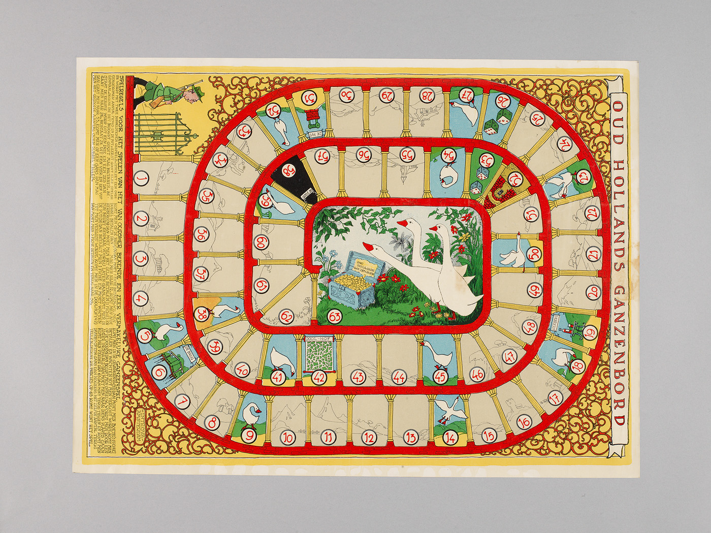 etiket op de koker: GANZENBORD/HET VAN OUDSHER BEKENDE EN ZEER VERMAKELIJKE GANZENSPEL MET DE ORIGINELE SPELREGELS = INTROVA = Amsterdam