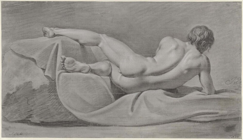 - Liggend mannelijk naakt, op de rug gezien, 1769 - 1793