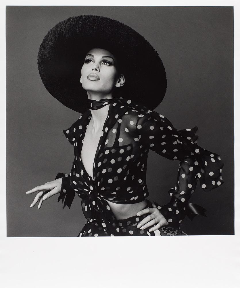 Fotomodel, half naar links gewend, in combinatie van doorschijnende organza met zwart-met witte noppen. Grote zwarte hoed. Zwart-wit foto, nr. 1 van de oplage.- Trefwoorden