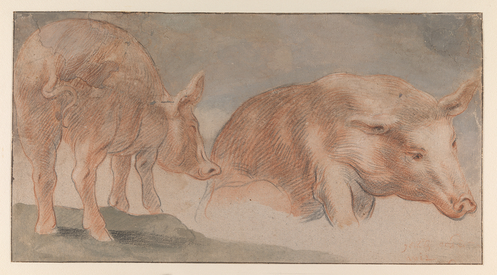 Coll. De Robiano, niet terug te vinden in de veiling Comte de Robiano e.a., Amsterdam (Fr. Muller / Mensing) 15-16 juni 1926, noch in de catalogus van de veiling Bellingham Smith, Comte de Robiano, Della Faille de Waerloos e.a., Amsterdam (Fr. Muller . Mensing) 5-6 juni 1927; Coll. A.W.M. Mensing, veiling Amsterdam (Fr. Muller) 27-29 april 1937, in nr. 835:' Jordaens et son école. Quatre dessins représentant: L´Adoration du veau d´or, deux cochons, tête de faune etc. (Fl. 65,- aan Museum Fodor); Aankoop 1937, vermeld in het jaarverslag over dat jaar, p. 15.