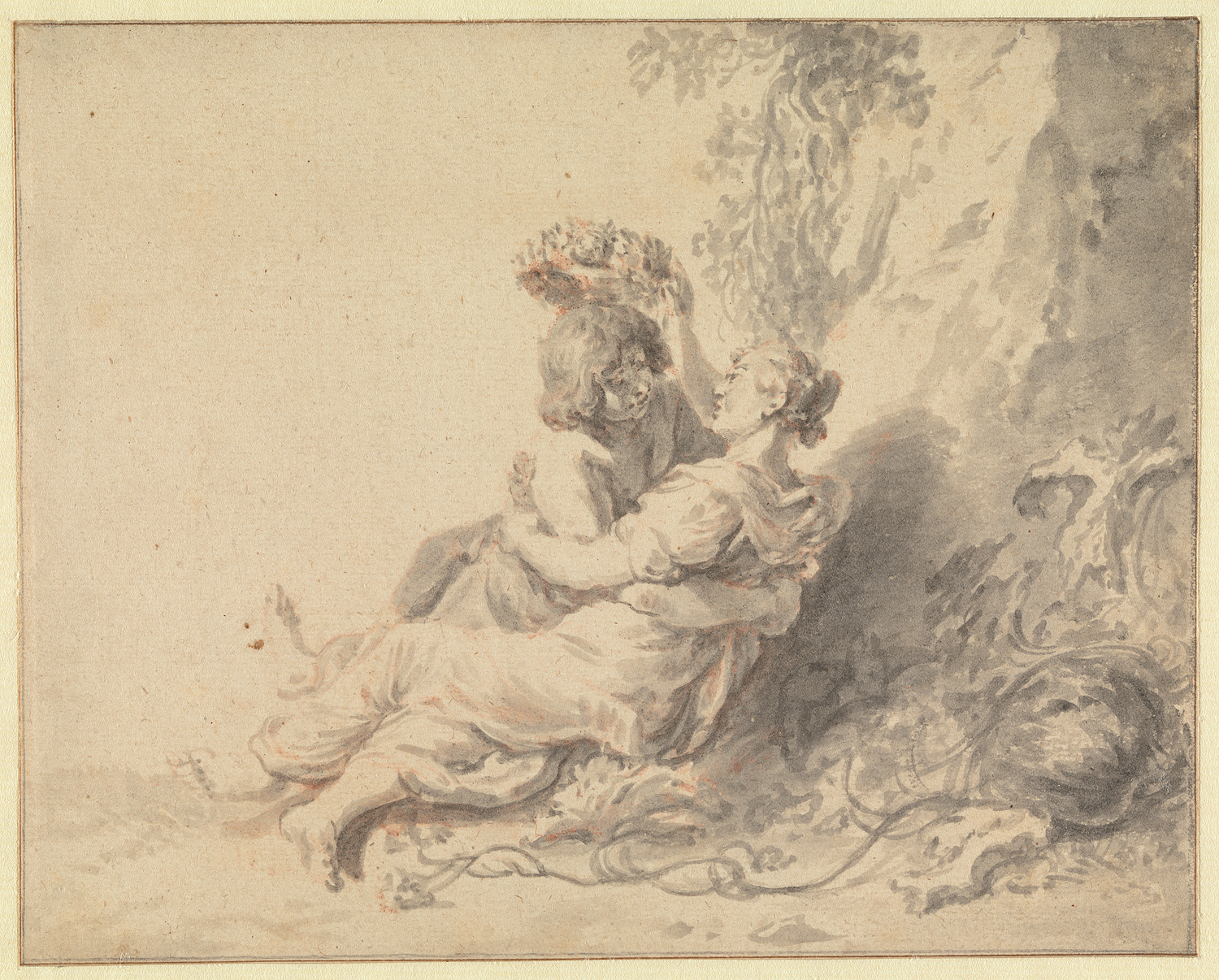 Deze tekening is gemaakt met penseel in grijs over rood en zwart krijt. Het behoort tot de vroege werken van De Braij. Voorgesteld is een stoeiend, omhelsend herderspaar, waarbij de herderin een krans op het hoofd van de herder zet. Achter hen is een rotswand te zien en op de grond naast hen ligt een kalebas met stengels en bladeren. Het tafereel is een detail dat De Braij heeft gekopieerd uit een schilderij van Pieter Lastman (1583-1633): 'Landschap met patorale staffage' (ca.1612) dat in particulier bezit is. ( Daphne Willemsen)