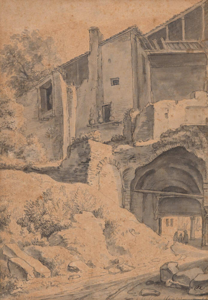 Huizen boven een oude stadsmuur, 1650 papier hoogte: 30.8 cm; breedte: 21.2 cm; monogram rechts onderaan: HSL: ineen