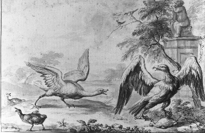 In Hondecoeters anecdotische voorstellingen eist nu eens niet de mens maar het dier de hoofdrol op. Van het gepresenteerde drama is veelal het moment suprême weergegeven. Deze uitgewerkte bladen zijn wellicht bedoeld als zelfstandige kunstwerken.
