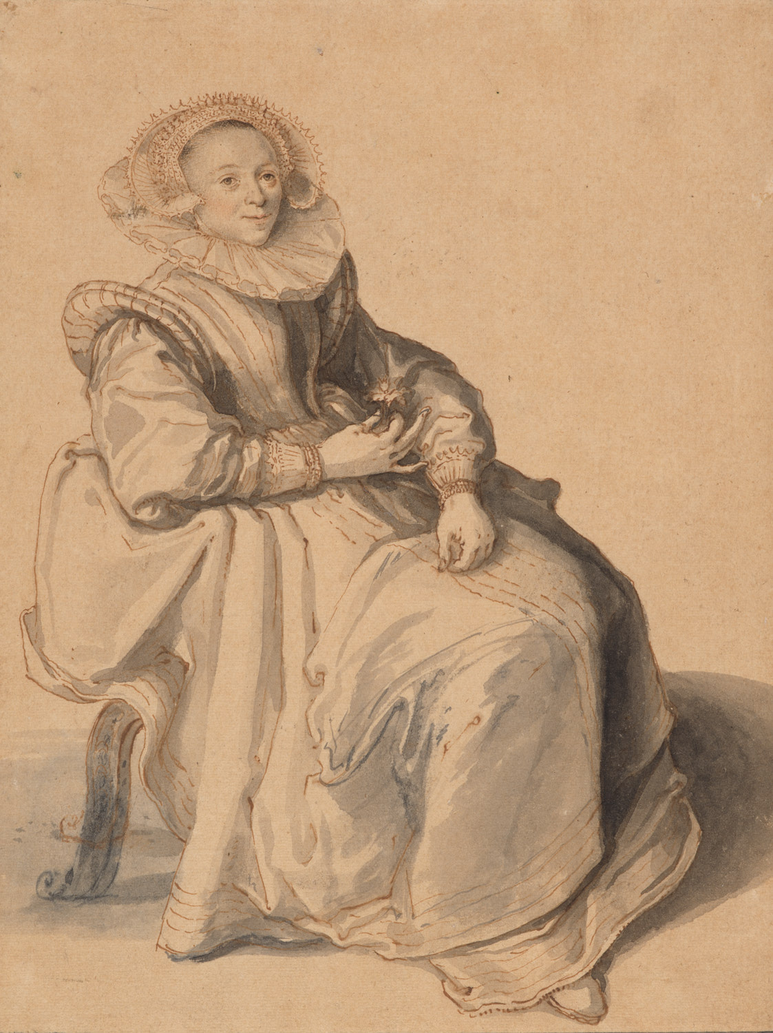 Coll. F. Heimsoeth, veiling Frankfurt a.M. (F.A.C. Prestel) 5 mei 1879 e.v.d., nr. 103:' Maître hollandais du XVIIe siècle. Une dame assise tournée vers la droite. Sa tête est couvert d´un bonnet richement brodé et garni de dentailles; le cou est entouré d´un col raide; elle tient un oeillet à la main droite. Beau dessin dans la manière de Mierevelt. A la plume et lavé d´encre de Chine. H. 0,218 - L. 0,165 (DM. 50,-); Coll. J.P. Heseltine; niet in de catalogi van de veilingen Amsterdam (Fr. Muller) 27-28 mei 1913, Londen (Sotheby) 25 april 1934, Londen (Sotheby) 27-29 mei 1935. Aankoop 1936 van Alfred Spero, Londen (£ 10/-/-), volgens documentatiearchief, vermeld in het jaarverslag, p. 16 (als J. de Gheyn)