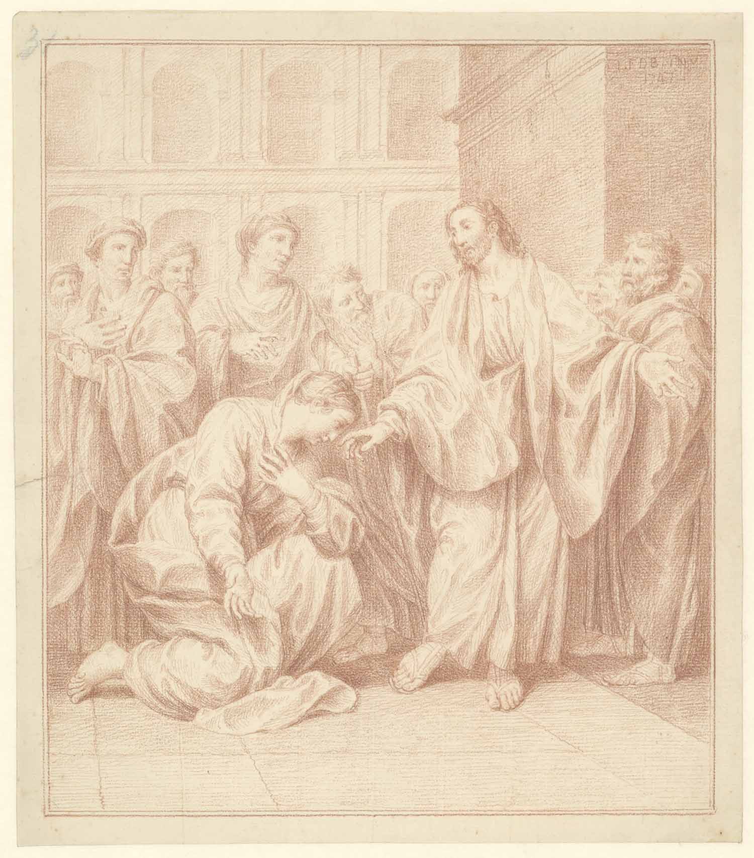 Een tekening in rood krijt met Christus geneest een bezetene in het Rijksprentenkabinet sluit in onderwerp, tekenstijl en formaat aan bij de krijtversie van Christus en de overspelige vrouw. Ze zijn met een jaar verschil gedateerd: het blad in het Rijksprentenkabinet in 1746 en dat in het AHM in 1747. ( Ingrid Oud)