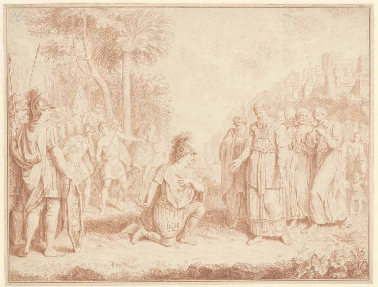 Nadat Abraham met zijn leger Lot had bevrijd uit de handen van koningen uit het Oosten, keerde hij terug in Jeruzalem. Daar ontmoette hij koning en hogepriester Melchisedek, die hem zegende en brood en wijn bracht (Gen. 14:18-24). Dubourg koos uit dit Oudtestamentische verhaal de ontmoeting van beide mannen. Abraham, gekleed als een Romeins veldheer, knielt voor Melchisedek. Jeruzalem is op de achtergrond zichtbaar.