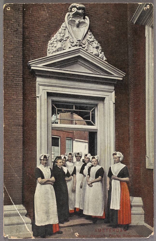 In het Amsterdamse Burgerweeshuis konden kinderen van Amsterdamse poorters (burgers met rechten om in de stad te wonen) terecht, die geen ouders of een moeilijke thuissituatie hadden. Het weeshuis was eeuwenlang een gesloten instelling, waar buitenstaanders niet zomaar naar binnen mochten. Voor de creatie van een fotoalbum, ter ere van het 25-jarige huwelijk van bouwkundige Pieter Heyn in 1904, werd een uitzondering gemaakt. Fotograaf August Stap maakte een unieke serie foto’s van het interieur, de wezen en het personeel van het Burgerweeshuis. Op de foto’s zijn de Burgerwezen tijdens hun dagelijkse bezigheden te zien. Zo komen onder meer de naailes voor meisjes, het ‘Slöjd’-onderwijs voor jongens en de zondagse gang op weg naar de kerk voorbij. Een groot aantal van de foto’s zijn later gebruikt voor de productie van een serie ansichtkaarten in kleur, waaronder deze ansichtkaart van weesmeisjes bij de poort tussen de meisjes- en de kinderbinnenplaats. ( Sarah Remmerts de Vries)